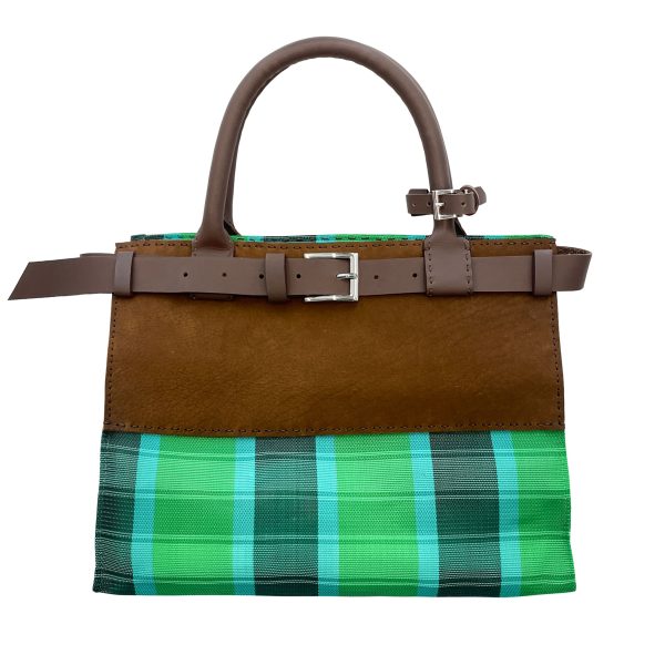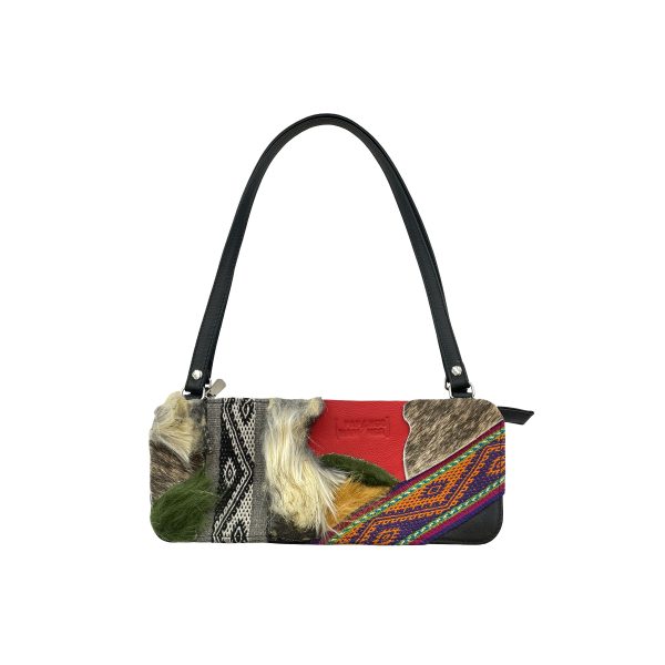 Bolso en colaboración con Huari, con distintos tipos de material (cuero, pelo, aguayo)