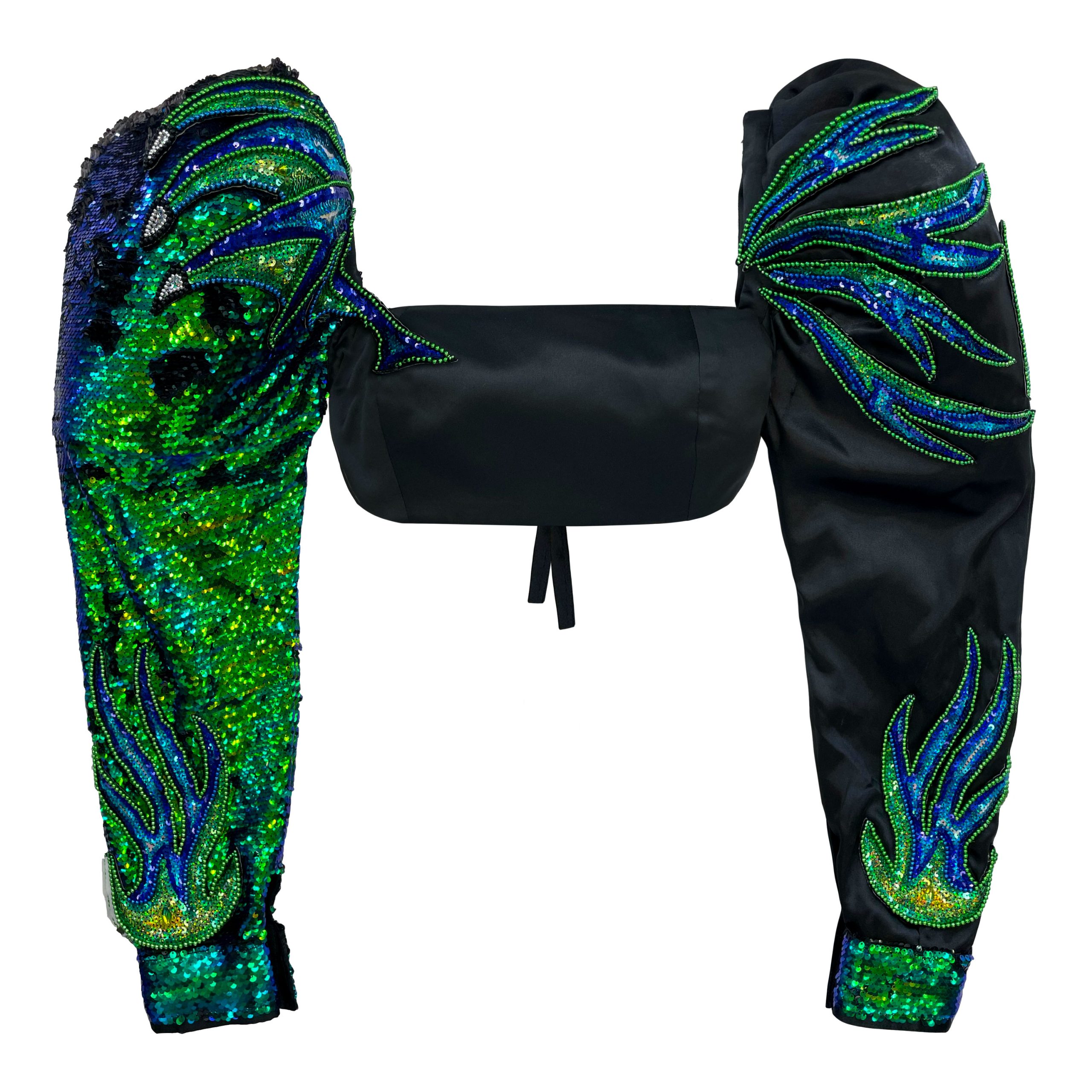 Top con mangas y hombreras estilo caporal, con parche bordado en lentejuelas.